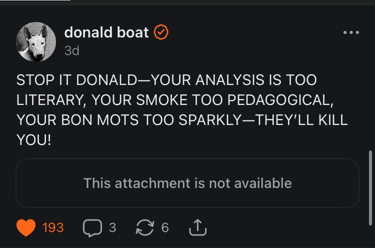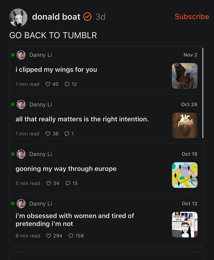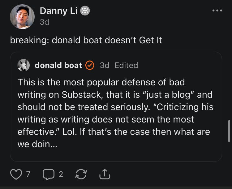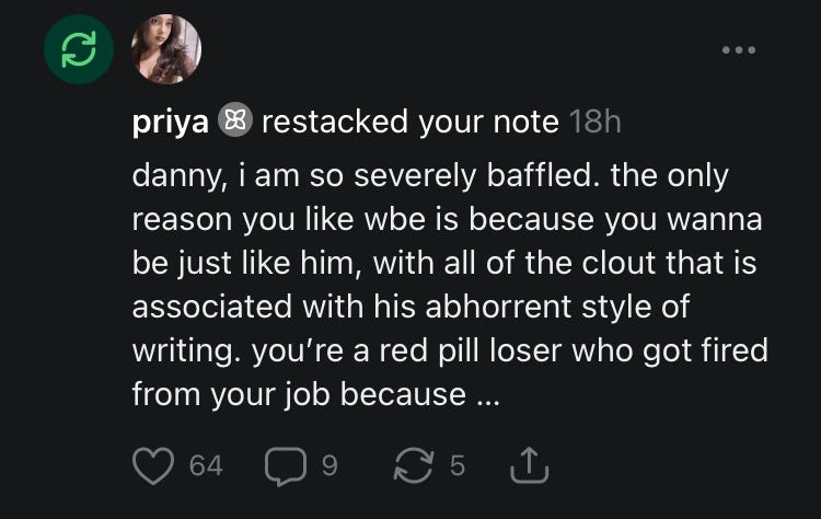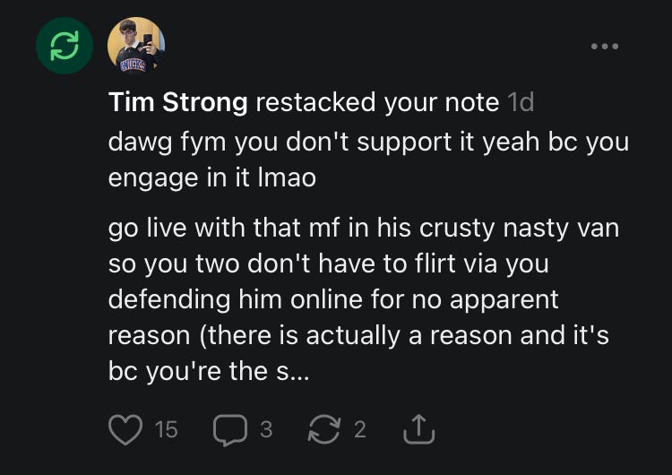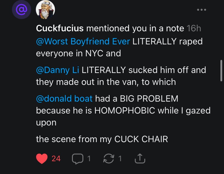went after the most notoriously depraved sex blog on Substack, . Like a moron, I defended the blog. Why? Because I like it. Because I speak my mind. Because fuck it, what’s the worst that could happen?I was not prepared to get absolutely pounded from every corner of this website.