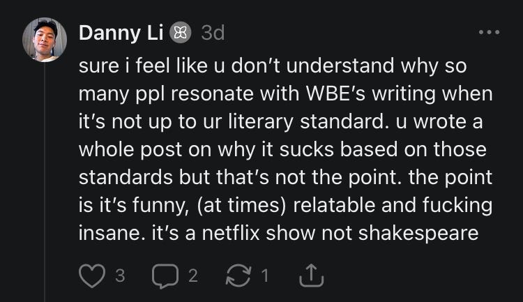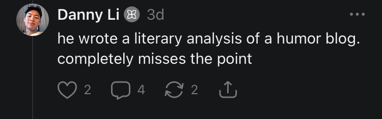 meh whatever fuck the haters i think ur hilarious, i cackled at this article & have cackled at other ones in the past. its a funny day when the internet thinks its deep