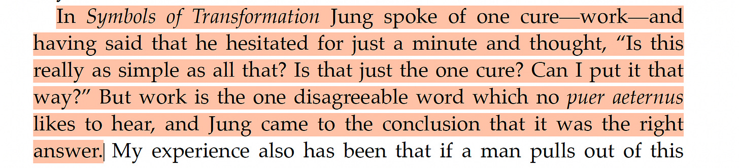 It doesn’t mean working when you feel like it, he says. Anyone can do that. Nor is it ‘working’ in order to avoid more important work4. What the puer aeternus needs — what he’s unwilling to accept — is to work when he doesn’t feel like working.