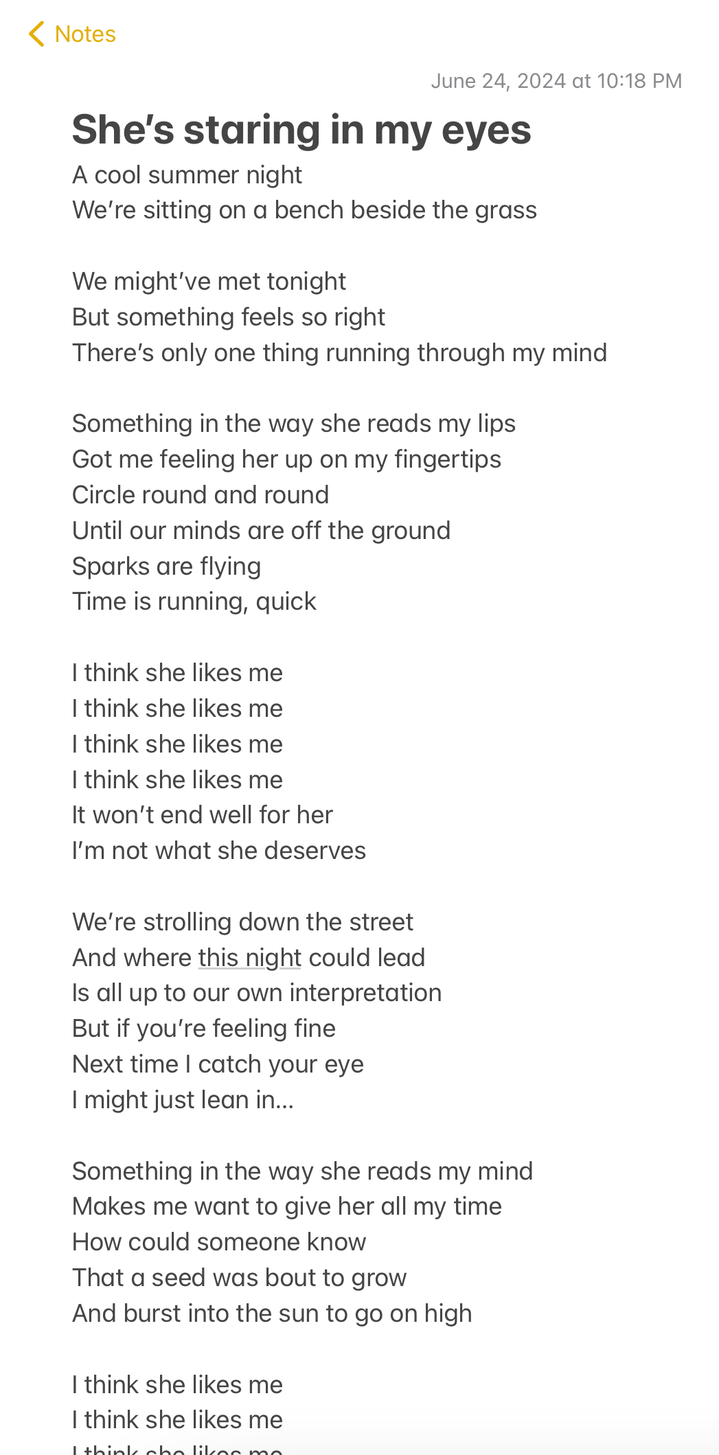 I wrote this after walking you home that first night, about that moment we spent on the bench beside the grass. How I almost leaned in and kissed you. It’s kind of a goofy song. But it’s also sad. And when you heard it you cried.