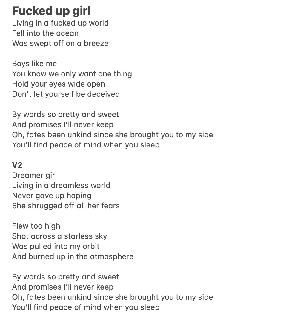 You hated this song. You never wanted to be thought of as a fucked up girl, but that’s how I thought of you. Because you were. I still loved you, long, long ago.