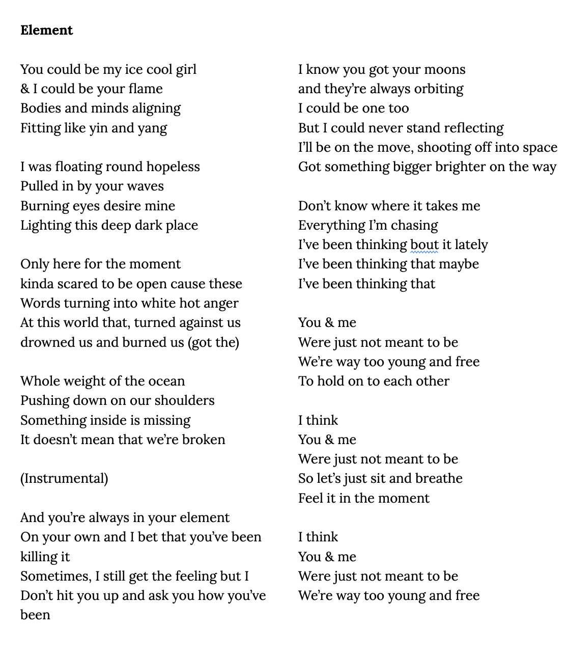 I wrote Element on a flight home from my first music festival. It’s about moving on and acceptance. The voices are from Zuko and Katara, and you’ll recognize the song I used in the first half. The second half samples the outro music from Avatar.