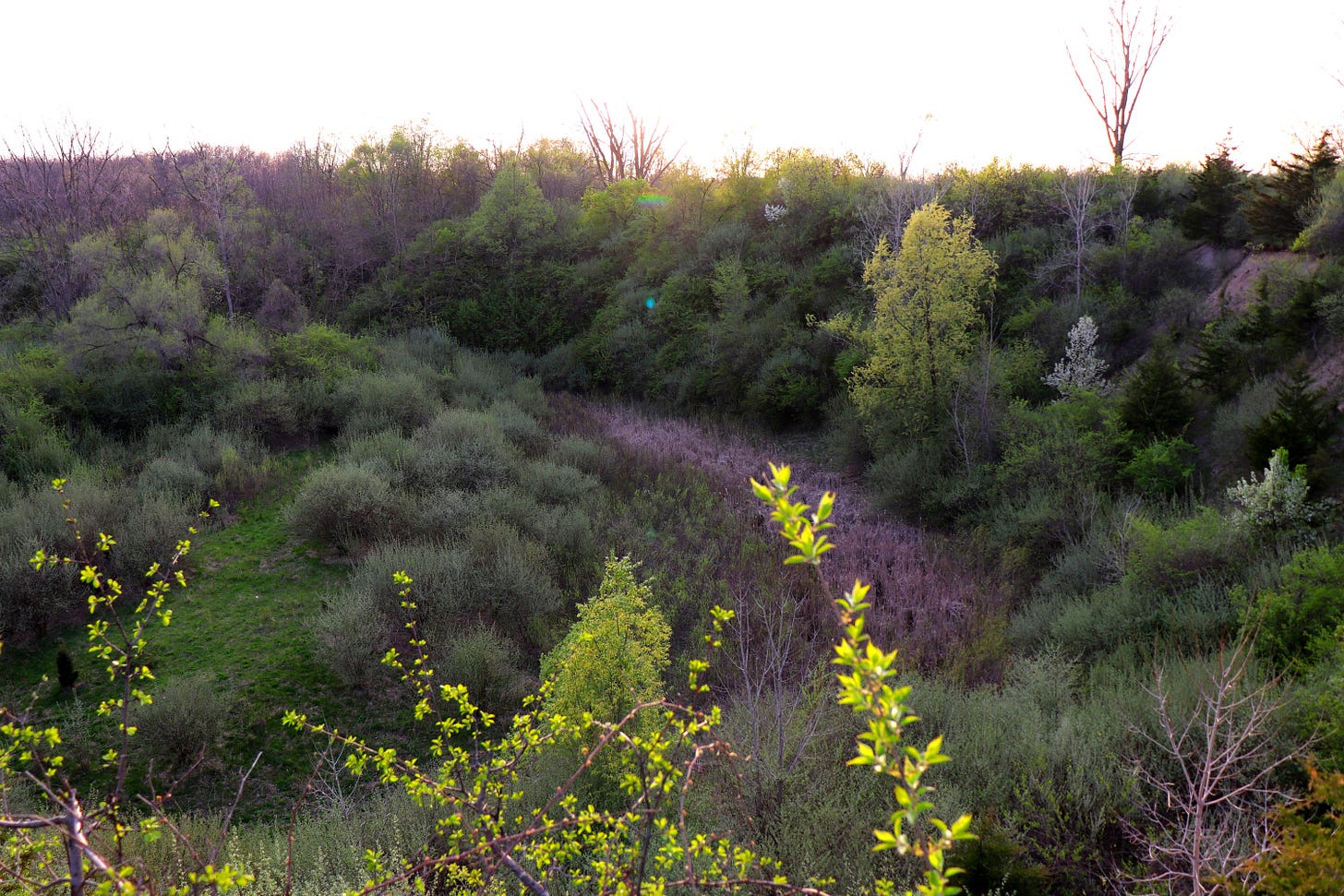 Over the top was a spectacular sight. We stood atop a high ridge that extended in a crescent around a deep basin, the center of which was the pond, bright and glimmering, filled with cattails, surrounded by trees and bushes. Birds chirped freely all around, a cacophony of song and language. Ladybugs and dragonflies zipped through the air. Three deer ran off upon our approach. Afternoon sun gave the whole place a soft glow, and we scrambled down the ridge, kicked off our shoes, and ran into the water, letting tadpoles wriggle around our toes.