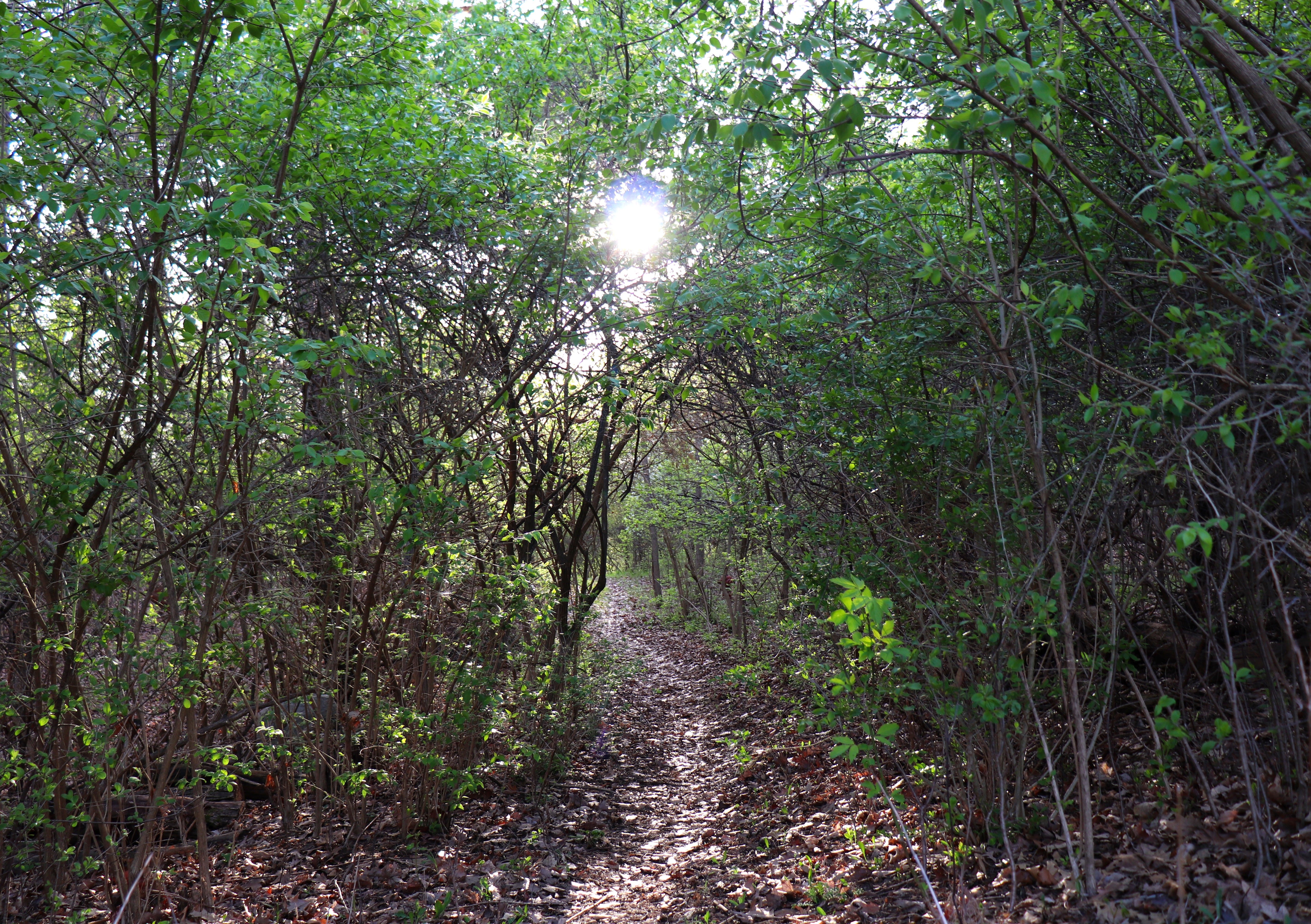 Beyond the stream was a long stretch of shaded woods. This area was eerily cool and quiet, with dark twists and turns that threatened coyote ambush.