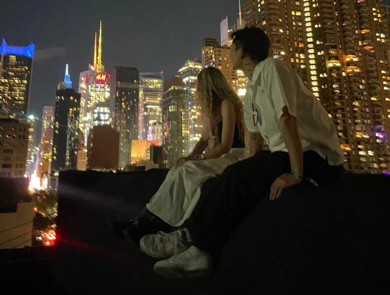 The three of us brought pizza to the roof of my apartment, the glittering panorama of Midtown Manhattan looking over us. I played you my music, and you told me I should film a music video. I told you I might. Your friend had to leave early.